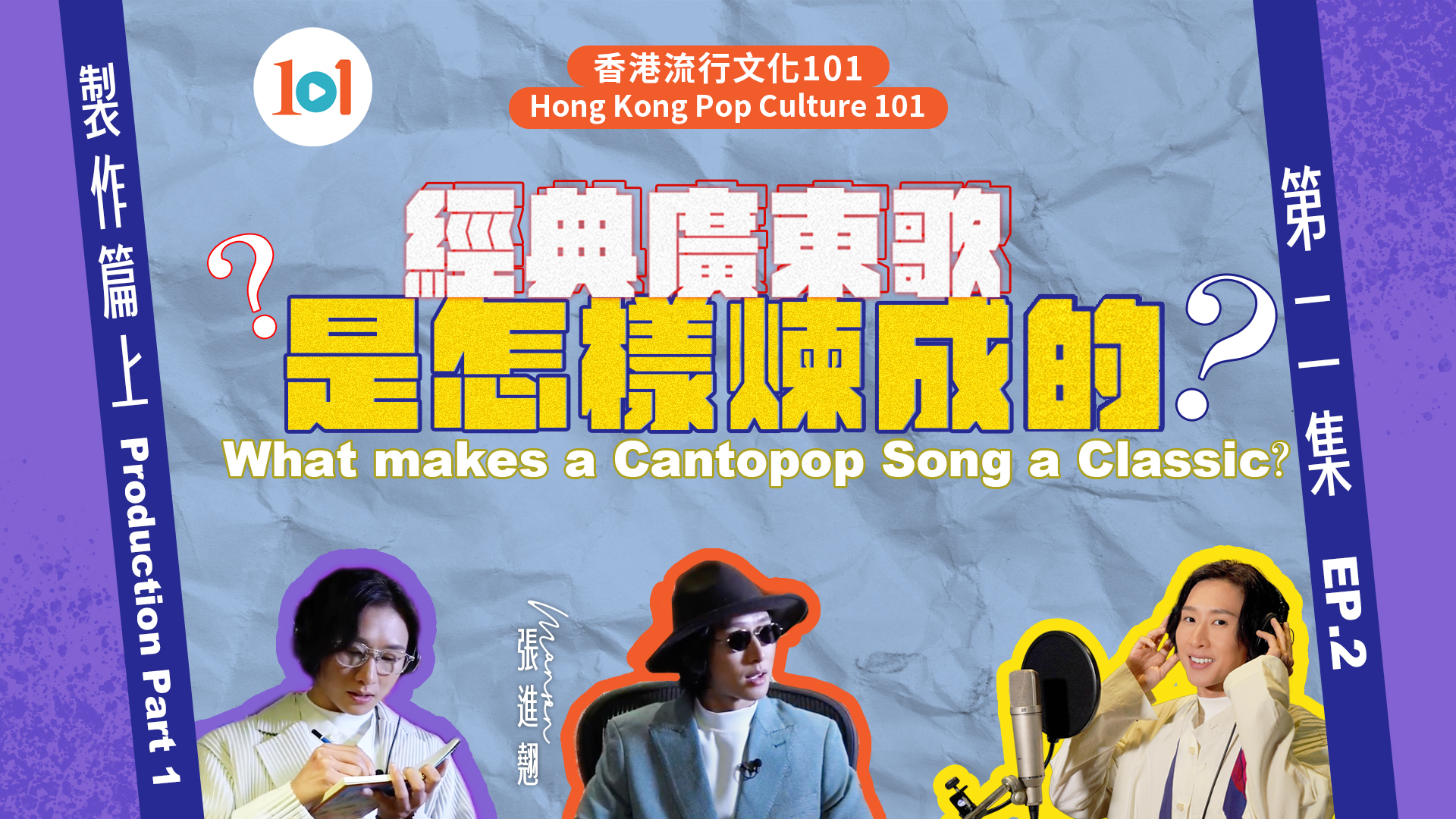 大家都喜欢听广东歌,但有没有想过一首经典广东歌是怎么诞生的?康文署寓乐频道「101入门教室」将会一连三集,由唱作歌手Manson张进翘与大家分享广东歌的特色和变迁,以及讲解曲、词、编、监、混、唱,这六个制作广东歌的主要岗位,为大家揭开歌曲制作的神秘面纱。